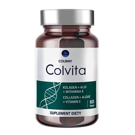 Ten suplement diety powstał, aby zapewnić lepszy wygląd skóry i maksymalnie poprawić jej gęstość. Zawarty w produkcie liofilizowany kolagen rybi, włączony w naturalne procesy metaboliczne, wspomaga odtwarzanie kolagenu ciała ludzkiego. Białko to stanowi aż 30% całkowitej masy protein w ciele człowieka i pełni wiele ról. Jest bowiem niezbędnym elementem utrzymania ciągłej odnowy komórek ciała i dobrej kondycji przestrzeni poza nimi (tzw. macierzy międzykomórkowej). To także składnik zapewniający m.in. jędrność i gęstość skóry oraz wspomagający jej właściwe napięcie i nawilżenie. Dodatek alg i najsilniejszego witaminowego wymiatacza wolnych rodników, czyli witaminy E, znakomicie wzmacnia biopotencjał Colvity o właściwości antyoksydacyjne.