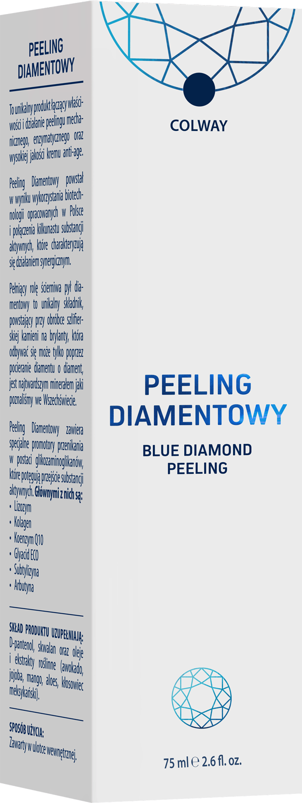 Peeling Diamentowy jest drugim kosmetykiem, który wraz z kremem Blue Diamond tworzy wyjątkową, nowoczesną Diamentową Linię od COLWAY. Ten unikalny produkt łączy właściwości i działanie peelingu mechanicznego, enzymatycznego oraz wysokiej jakości kremu anti-age. To innowacyjne rozwiązanie powstało w wyniku wykorzystania biotechnologii opracowanych w Polsce i połączenia kilkunastu substancji aktywnych, które charakteryzują się działaniem synergicznym.